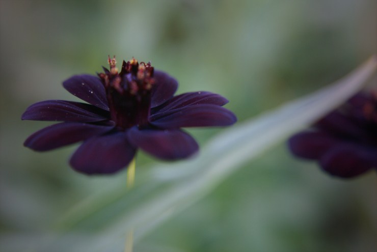 Cosmos atrosanguineus ‘chocolat’, au parfum de cacao, en mélange avec des Knautia. Dans le jardin de l’Atelier.