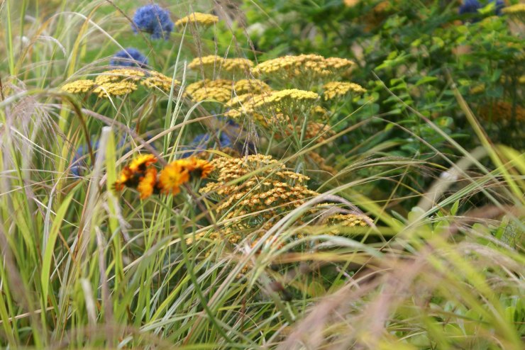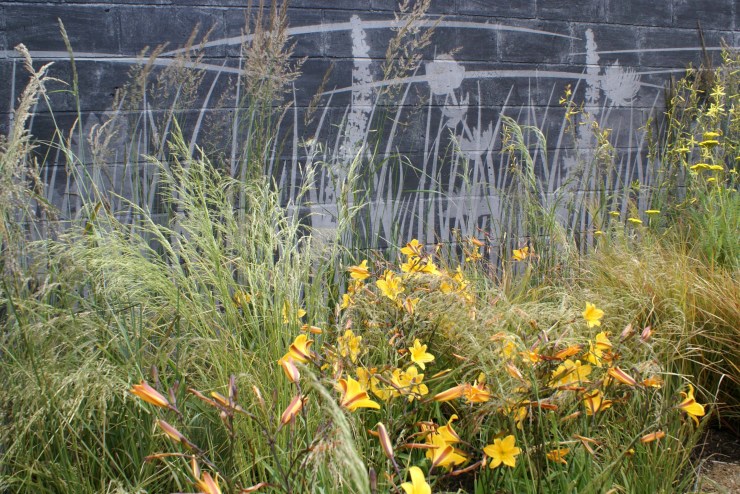 The Landform garden, par Catherine Mac Donald, s’inspire librement des plantations naturalistes de la High Line à New York, en contraste aux lignes strictes de l’aménagement. Une gamme de couleurs subtile et inhabituelle, où les bleus et les orangers se grisent et s’harmonisent.