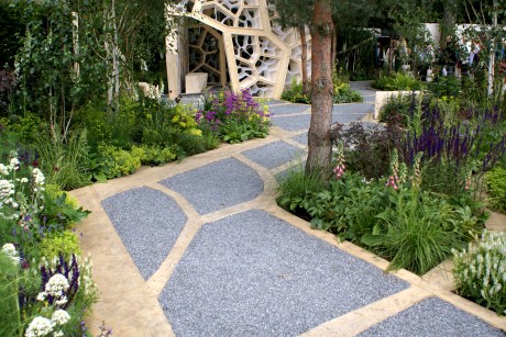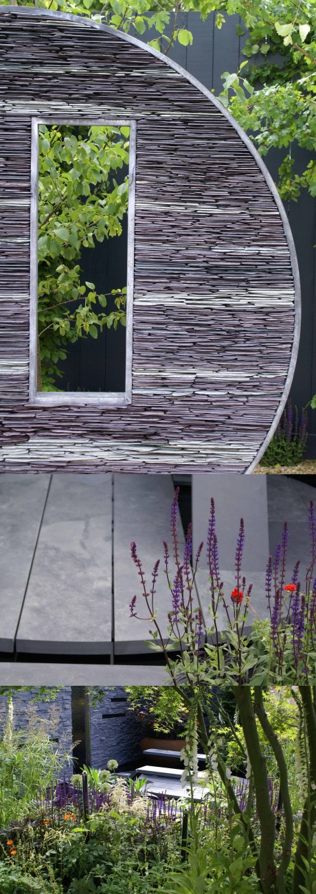 En haut, sculpture par Tom Stogdon. // Jardin conceptuel représentant les quatre éléments, par Olivia Kirk. Above : slate sculpture by Tom Stogdon. Concept garden representing the fourth elements by Olivia Kirk.