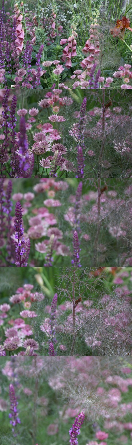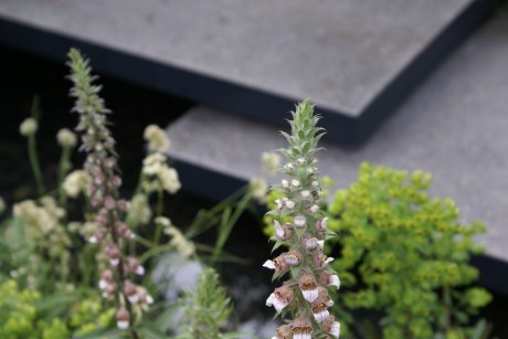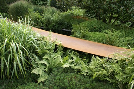 Dessiné par Robert Myers, évocation d’un voyage d’un bord de mer vers un refuge, un jardin graduel, transition des plantes de littoral survivant dans les graviers vers une végétation plus luxuriante enveloppant confortablement le pavillon. Robert Myers’s route from a barren seashore to a safe, raised, sheltered space, surrounded by lush planting.