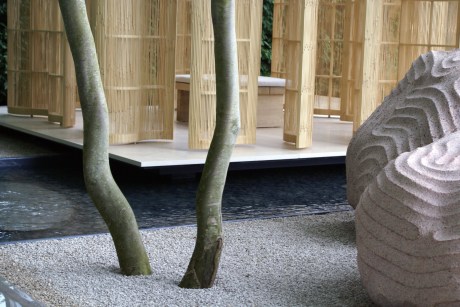 Dessiné par Luciano Giubbilei, pavillon japonisant flottant sur un massif informel, harmonie étrange et inhabituelle de gris doré rosé. Designed by Luciano Giubbilei, the pavilion is floating over water and sublimely undunlating rosé tinted planting.