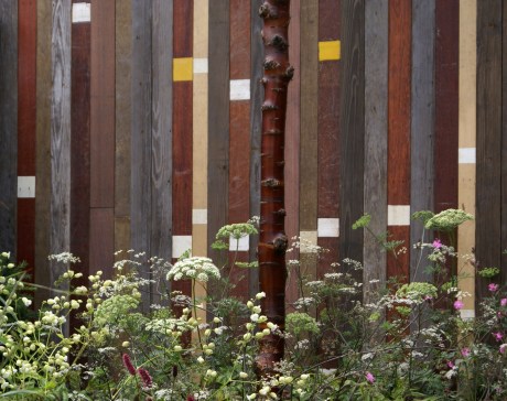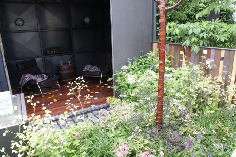 Petit jardin urbain dessiné par Jamie Dunstan. Esprit industriel, bois de récupération (merbau, érable) créant un remarquable arrière-plan aux massifs informels, écorce magnifique des Prunus serrula tibetica. Designed by Jamie Dunstan, The boundaries are constructed from recycled timber, highlighting the garden’s industrial feel and creating a strong backdrop for the loose planting.