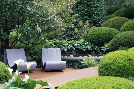 Jardin d’Adam Frost, d’après l’architecte Frank Lloyd Wright, éléments organiques et lignes sobres du béton poli se répondent en un lieu très contemporain et inspirant. Adam Frost’s stylish outdoor space is inspired by Frank L.Wright. Polished concrete pads form stepping-stones across a pond and a wall of falling water provides movement. Handcrafted seats echo Wright’s love of organic elements, while the overall effect is complemented by a restrained selection of architectural planting to create a haven of calm.