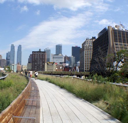 Septembre 2011. Visite de la High Line, promenade publique à l’ouest de Manhattan, empruntant la structure d’une ligne de métro aérien datant de 1934 et désaffectée dans les années 80. L’association des Amis de la High Line milite depuis 1999 pour la conservation de la ligne historique, menacée de destruction à maintes reprises. Dans le cadre d’une revalorisation plus globale du quartier de Meatpacking, West Chelsea, la réhabilitation de la voie ferrée fut l’objet du concours ‘Designing the High Line’ en 2003, en partenariat avec la ville de New York. Parmi 720 équipes de 36 pays, fut sélectionnée celle de James Corner Field Operations, une entreprise d’aménagement paysager, et Diller Scofidio + Renfro, un cabinet d’architectes. Un 1er opus du projet fut ouvert au public en juin 2009, de Gansevoort Street à West 20th Street, et la 2ème section jusqu’à la West 30th Street fut inaugurée en juin 2011.