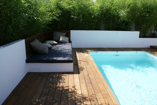 Small urban garden inspired by a recent journey in Venice,CA. Privacy, tidy design and luscious foliage reflecting californian courtyards. The essentials : pool, outdoor shower, comfy bench, ambient lighting.