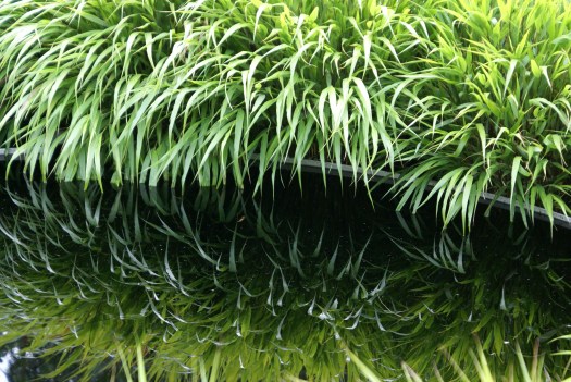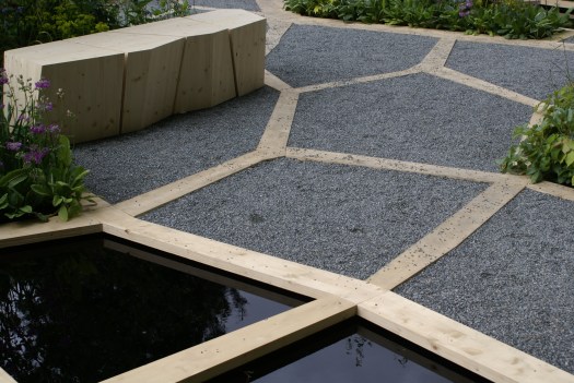 Jardin d’Adam Frost, d’après l’architecte Frank Lloyd Wright, éléments organiques et lignes sobres du béton poli se répondent en un lieu très contemporain et inspirant. Adam Frost’s stylish outdoor space is inspired by Frank L.Wright. Polished concrete pads form stepping-stones across a pond and a wall of falling water provides movement. Handcrafted seats echo Wright’s love of organic elements, while the overall effect is complemented by a restrained selection of architectural planting to create a haven of calm.
