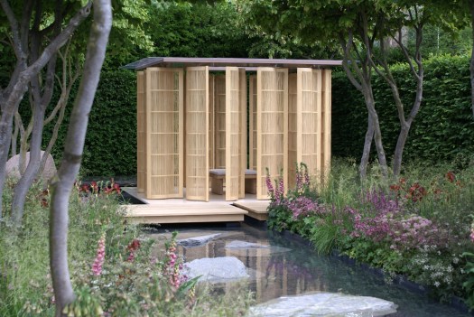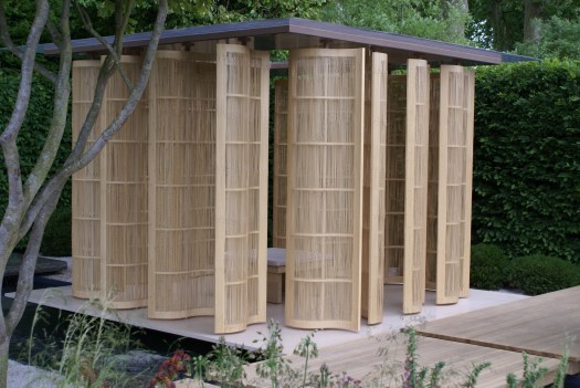 Dessiné par Luciano Giubbilei, pavillon japonisant flottant sur un massif informel, harmonie étrange et inhabituelle de gris doré rosé. Designed by Luciano Giubbilei, the pavilion is floating over water and sublimely undunlating rosé tinted planting.