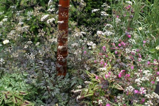 Dessiné par Robert Myers, évocation d’un voyage d’un bord de mer vers un refuge, un jardin graduel, transition des plantes de littoral survivant dans les graviers vers une végétation plus luxuriante enveloppant confortablement le pavillon. Robert Myers’s route from a barren seashore to a safe, raised, sheltered space, surrounded by lush planting.